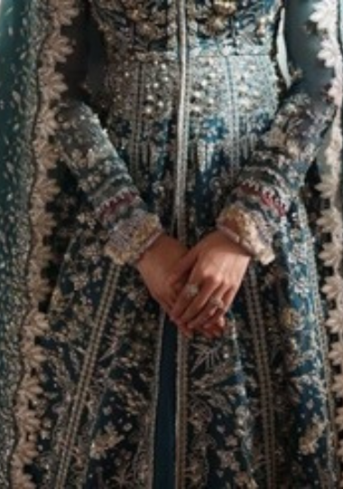 Silver floral motifs shimmer across this organza pishwas, enhanced with sequins and intricate tilla embroidery. The flowing panels, accented with a sage satin border, create a graceful silhouette, while the organza dupatta with sequin-trimmed edges adds a whisper of enchantment. With meticulously crafted front and back panels, sleeves, hem borders, and paired with raw silk slip and trousers, this ensemble radiates timeless elegance and feminine charm.