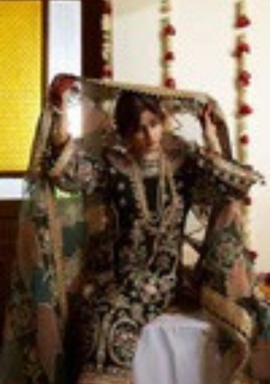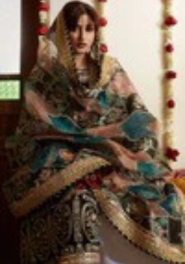 Basgul is a striking soot-toned ensemble worn by Sajal Aly, adorned with cascading floral vines and motifs delicately arranged within architectural arches. The organza kameez is richly hand-embellished with gota, dabka, hand-cut sequins, and pearls, creating depth and dimension. It is paired with an embroidered Dhaka pajama finished with refined chatta patti borders. Completing the look is a laser-cut organza dupatta, intricately detailed with embroidered motifs and chatta patti in soft hues of baby pink and blue, lending an artistic and contemporary finish to this timeless design.