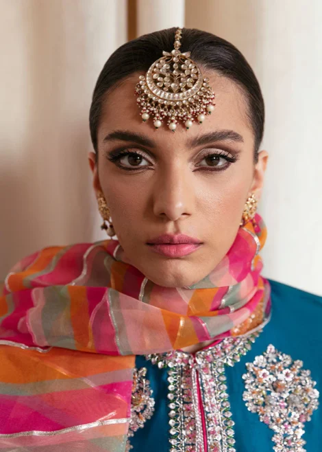 FEROZEAH is an elegant long shirt rendered in a serene aqua hue, delicately adorned with intricate silver embellishments. Handcrafted floral motifs and fine handwork form a graceful jaal across the silhouette, exuding understated luxury. The sheer dupatta, finished with a richly embellished border and scattered sequins, lends an ethereal charm, while straight-cut azar trousers complete the look. Subtle peacock motifs at the hem, detailed with silver threadwork and embellishments, echo the shirt’s artistry, creating a harmonious blend of tradition and modern sophistication. Designed for the woman who commands attention, Ferozeah turns every step into a statement of timeless elegance.