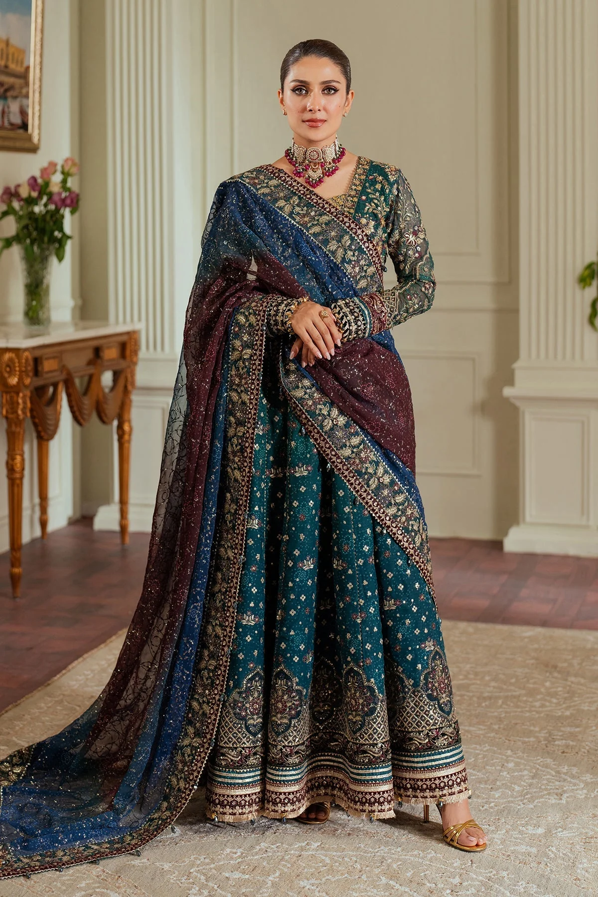 A printed chiffon dupatta adorned with sequins and threadwork include embroidered organza and velvet border to match the aesthetic of the ensemble, enhancing its luxury.