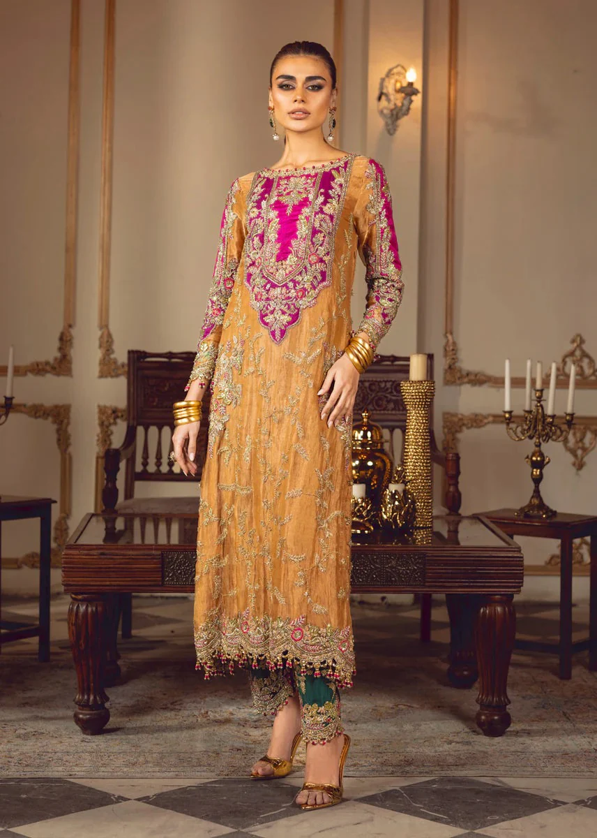 In the dimly lit room, Miraal emerges like a spectral bloom created with pure tissue in pale tangerine tone adorned with ethereal floral motifs paying homage to tales of ancient traditions. The ensemble celebrates old school elegance with each taanka…