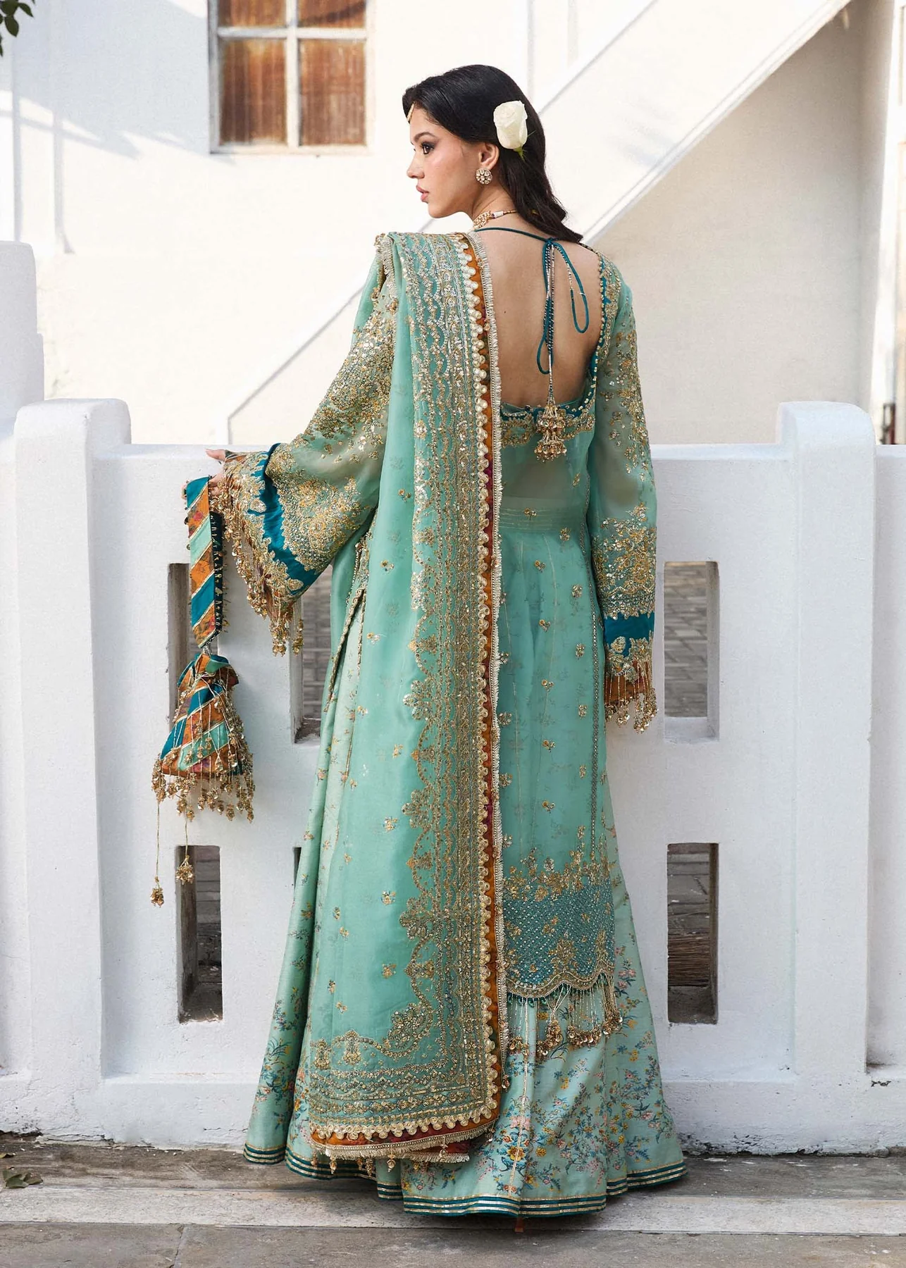 An intricate details on embroidered organza shirt adds a touch of elegance and glamour to the overall design. This shirt is paired with a digitally printed Korean raw-silk sharara. Lastly, the organza sequin-embroidered dupatta borders lend a graceful and modern..