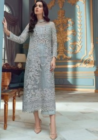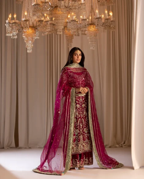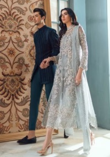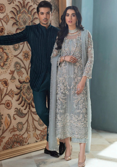 This ice blue long shirt, tailored from pure silk organza, is richly adorned with crystal and intricate threadwork, paired with raw silk pants and a pearl-embellished dupatta to create a dreamy, ethereal ensemble.