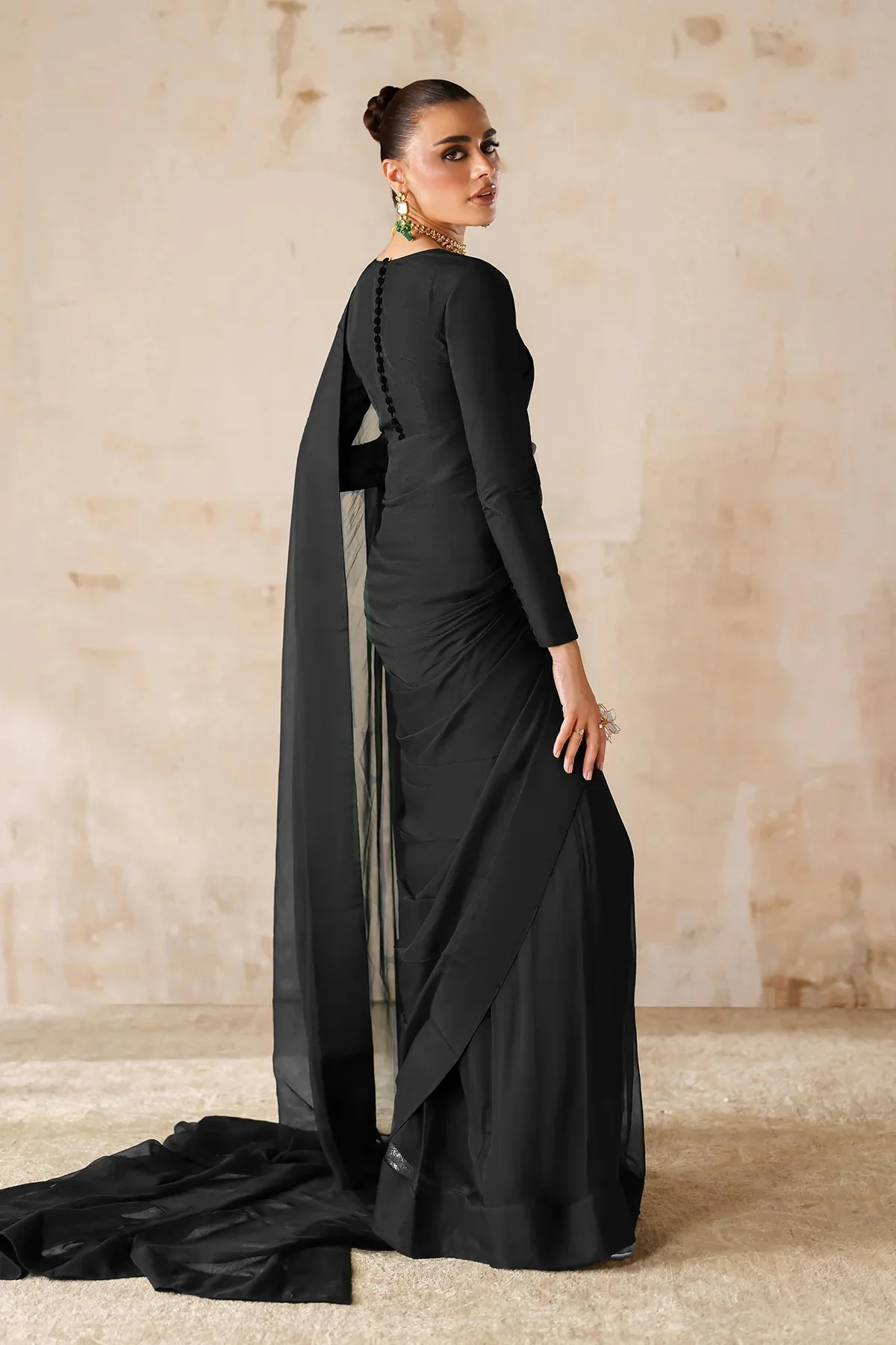 This elegant black saree captures the essence of timeless beauty and sophistication. Crafted from a fluid, lightweight fabric, it drapes effortlessly, accentuating the natural silhouette. The full-sleeved blouse adds a refined, contemporary touch to its classic appeal. Perfect for evening…